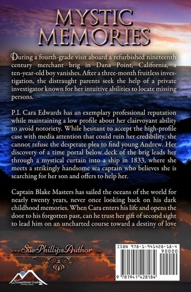 When a fourth-grade classroom of school children spend the night aboard a refurbished nineteenth century merchant brig in Dana Point, California, one of them disappears in the night. After a three-month fruitless investigation, the distraught parents are led to private investigator, Cara Edwards, who relies on her sixth sense as much her common sense to solve a case. But when her psychic connection to the lost boy draws her back to 1833 California, she must find a way to bring them both back to the future. Captain Blake Masters has sailed the oceans of the world for nearly twenty years, never once looking back on his dark childhood memories. When Cara enters his life and opens the door to his forgotten past, can he trust her psychic insight to lead him on an uncharted course toward a destiny of love and compassion?