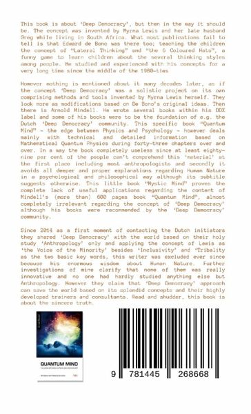 Dear readers. This book is about 'Deep Democracy', but then in the way it should be. The concept was invented by Myrna Lewis and her late husband Greg while living in South Africa. What most publications fail to tell is that Edward de Bono was there too; teaching the children the concept of "Lateral Thinking" and "the 6 Coloured Hats", a funny game to learn children about the several thinking styles among people. He studied and experienced with his concepts for a very long time since the middle of the 1980-ties. However nothing is mentioned about it many decades later, as if the concept 'Deep Democracy' was a solistic project on its own comprising methods and tools invented by Myrna Lewis herself. They look more as modifications based on De Bono's original ideas. Then there is Arnold Mindell. He wrote several books within his DDX label and some of his books were to be the foundation of e.g. the Dutch 'Deep Democracy' community. This specific book "Quantum Mind" - the edge between Physics and Psychology - however deals mainly with technical and detailed information based on Mathematical Quantum Physics during forty-three chapters over and over. In a way the book completely useless since at least eighty-nine per cent of the people can't comprehend this 'material' at the first place including most anthropologists and secondly it avoids all deeper and proper explanations regarding Human Nature in a psychological and philosophical way although its subtitle suggests otherwise. This little book "Mystic Mind" proves the complete lack of useful applications regarding the content of Mindell's (more than) 600 pages book "Quantum Mind", almost completely irrelevant regarding the concept of 'Deep Democracy' although his books were recommended by the 'Deep Democracy' community. Since 2014 as a first moment of contacting the Dutch initiators they shared 'Deep Democracy' with the world based on their holy study 'Anthropology' only and applying the concept of Lewis as 'the Voice of the Minority' besides 'Inclusivity' and 'Tribality as the two basic key words, this writer was excluded ever since because his enormous wisdom about Human Nature. Further investigations of mine clarify that none of them was really innovative and no one had hardly studied anything else but Anthropology. However they claim that 'Deep Democracy' approach can save the world based on its splendid concepts and their highly developed trainers and consultants. Read and shudder, this book is about the