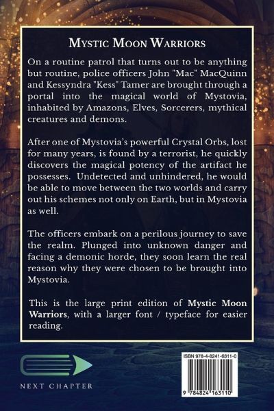 On a routine patrol that turns out to be anything but routine, police officers John "Mac" MacQuinn and Kessyndra "Kess" Tamer are brought through a portal into the magical world of Mystovia, inhabited by Amazons, Elves, Sorcerers, mythical creatures and demons. After one of Mystovia's powerful Crystal Orbs, lost for many years, is found by a terrorist, he quickly discovers the magical potency of the artifact he possesses. Undetected and unhindered, he would be able to move between the two worlds and carry out his schemes not only on Earth, but in Mystovia as well. The officers embark on a perilous journey to save the realm. Plunged into unknown danger and facing a demonic horde, they soon learn the real reason why they were chosen to be brought into Mystovia. This is the large print edition of Mystic Moon Warriors, with a larger font / typeface for easier reading.