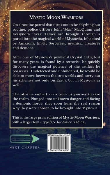On a routine patrol that turns out to be anything but routine, police officers John "Mac" MacQuinn and Kessyndra "Kess" Tamer are brought through a portal into the magical world of Mystovia, inhabited by Amazons, Elves, Sorcerers, mythical creatures and demons. After one of Mystovia's powerful Crystal Orbs, lost for many years, is found by a terrorist, he quickly discovers the magical potency of the artifact he possesses. Undetected and unhindered, he would be able to move between the two worlds and carry out his schemes not only on Earth, but in Mystovia as well. The officers embark on a perilous journey to save the realm. Plunged into unknown danger and facing a demonic horde, they soon learn the real reason why they were chosen to be brought into Mystovia. This is the large print edition of Mystic Moon Warriors, with a larger font / typeface for easier reading.