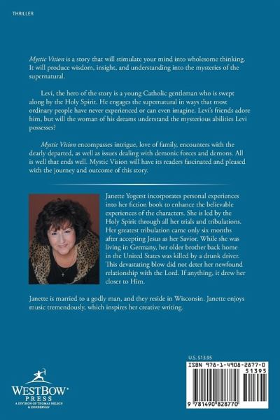Mystic Vision is a story that will stimulate your mind into wholesome thinking. It will produce wisdom, insight, and understanding into the mysteries of the supernatural. Levi, the hero of the story is a young Catholic gentleman who is swept along by the Holy Spirit. He engages the supernatural in ways that most ordinary people have never experienced or can even imagine. Levi's friends adore him, but will the woman of his dreams understand the mysterious abilities Levi possesses? Mystic Vision encompasses intrigue, love of family, encounters with the dearly departed, as well as issues dealing with demonic forces and demons. All is well that ends well. Mystic Vision will have its readers fascinated and pleased with the journey and outcome of this story.