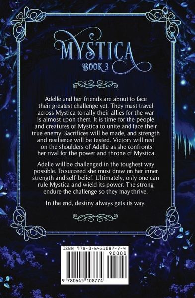 Mystica is in danger. Dark magic has spread poison, threatening the island at its very core. Sides have been chosen, and sacrifices will be made. In the end, destiny always gets its way. Adelle and her friends are about to face their greatest challenge yet. They must travel across Mystica to rally their allies for the war is almost upon them. It is time for the people and creatures of Mystica to unite and face their true enemy. Sacrifices will be made, and strength and resilience will be tested. Victory will rest on the shoulders of Adelle as she confronts her rival for the power and throne of Mystica. Adelle will be challenged in the toughest way possible. To succeed she must draw on her inner strength and self-belief. Ultimately, only one can rule Mystica and wield its power. The strong endure the challenge so they may thrive. In the end, destiny always gets its way.
