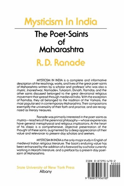 Mysticism in India is a complete and informative description of the teachings, works, and lives of the great poet-saints of Maharashtra written by a scholar and professor who was also a mystic. Jnaneshwar, Namadev, Tukaram, Eknath, Ramdas, and the other saints discussed belonged to the great devotional religious movement that spread through medieval India. With the exception of Ramdas, they all belonged to the tradition of the Varkaris, the most popular sect in contemporary Maharashtra. Their compositions exemplify the universality of their faith and practice, and are recognized as literary treasures. Ranade was primarily interested in the poet-saints as mystics-teachers of the perennial philosophy-whose experiences have general metaphysical and religious implications. At the heart of his classic is a comprehensive, objective presentation of the thought of these saints, augmented by a deep appreciation of their value and relevance to present-day scholars and seekers. Mysticism in India is the only major study in English of medieval Indian religious literature. The book's enduring value has been enhanced by the addition of a foreword by a scholar currently working in Marathi literature, and a preface by a present-day poet-saint of Maharashtra.