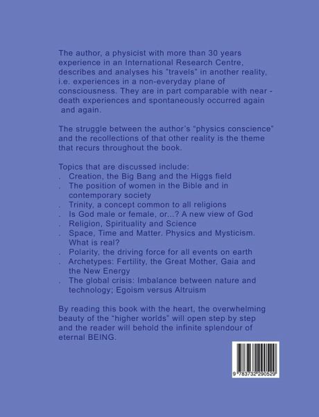In his book, the author, a physicist with more than 30 years experience in an International Research Centre, describes and analyses his "travels" in another reality, i.e. experiences in a not-everyday plane of consciousness. They are called "holotropic" i.e. aiming towards the "Whole" and are in part comparable with near-death experiences and spontaneously occurred again and again (without the use of drugs!). The struggle between the author's "physics conscience" and the recollections of that other reality is the theme that recurs throughout the book.Topics that are discussed include: _Creation, the Big Bang and the Higgs field_The position of women in the Bible and in contemporary society_ Trinity, a concept common to all religions_Is God male or female, or...? A new view of God_Religion, Spirituality and Science_Space, Time and Matter. Physics and Mysticism. What is real? _Polarity, the driving force for all events on earth_Archetypes: Fertility, the Great Mother, Gaia and the New Energy_The global crisis: Imbalance between nature and technology; Egoism versus Altruism. By reading this book with the heart, the overwhelming beauty of the "higher worlds" will open step by step and the reader will behold the infinite splendour of eternal BEING.