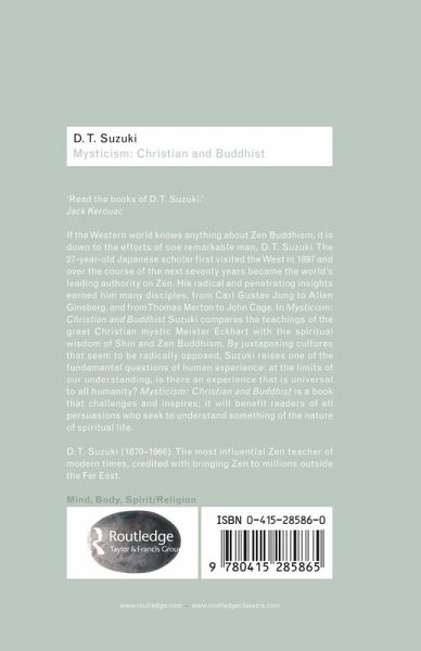 If the Western world knows anything about Zen Buddhism, it is down to the efforts of one remarkable man, D.T. Suzuki. The twenty-seven year-old Japanese scholar first visited the West in 1897, and over the course of the next seventy years became the world's leading authority on Zen. His radical and penetrating insights earned him many disciples, from Carl Jung to Allen Ginsberg, from Thomas Merton to John Cage. In Mysticism: Christian and Buddhist Suzuki compares the teachings of the great Christian mystic Meister Eckhart with the spiritual wisdom of Shin and Zen Buddhism. By juxtaposing cultures that seem to be radically opposed, Suzuki raises one of the fundamental questions of human experience: at the limits of our understanding is there an experience that is universal to all humanity? Mysticism: Christian and Buddhist is a book that challenges and inspires; it will benefit readers of all religions who seek to understand something of the nature of spiritual life.