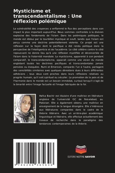 La vulnérabilité des croyances a enflammé le flux des perceptions dans son impact le plus important aujourd'hui. Nous sommes confrontés à la division explosive des fondements de l'islam. Dans les polémiques politiques, le monde est ébloui par le tourbillon mystique et soufi, tandis que l'islam est perçu comme une doctrine potentiellement violente. Ce projet est une réflexion sur la façon dont le pacifique a été rendu politique dans la perspective de l'intelligentsia et de l'académie. Le côté célèbre contre le côté repoussant ne donne lieu qu'à une réflexion mystifiée et déconcertée de l'Islam dans la fraternité mondiale. Le mysticisme, apparenté à son pendant comparatif, le transcendantalisme, apparaît comme une vision du monde englobant toutes les doctrines pacifiques et transcendantales jamais pensées ou évoquées. Rumi et Emerson, comparés l'un à l'autre, partagent des sensibilités similaires avec quelques déviations dues à leurs différentes adhésions ; tous deux sont proches dans leurs réflexions relatives au progrès humain, qu'il soit spirituel ou séculier. La promotion de la paix et de l'harmonie dans le monde est un besoin immédiat, surtout lorsqu'il s'agit de la binarité entre l'image factuelle et l'image fabriquée de la foi.