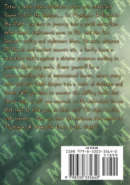 Step into a world where shadows loom large, whispers echo in the darkness, and ancient secrets stir beneath the surface. In "Mystique: A Bump in the Night," readers are transported to a realm where the line between imagination and reality blurs, and the supernatural forces that linger in the shadows come to life. As Halloween approaches, a chance discovery sets in motion a series of chilling events that will test the limits of courage and resilience. In the quaint town where the story unfolds, a mysterious porcelain doll holds a dark secret, one that threatens to unleash a malevolent presence upon those who dare to uncover its mysteries. From the eerie whispers that fill the night to the inexplicable occurrences that unsettle the senses, the tale of "Mystique: A Bump in the Night" unfolds with a sense of foreboding and intrigue. As the characters navigate the twists and turns of a world where nothing is as it seems, readers are drawn into a web of suspense and mystery that will keep them guessing until the final page. Through a masterful blend of vivid imagery, atmospheric storytelling, and compelling characters, the book invites readers to embark on a journey of discovery and fear. From the heart-pounding moments of tension to the haunting revelations that lie just beyond the shadows, "Mystique: A Bump in the Night" offers a glimpse into a world where the supernatural and the mundane collide in a spine-tingling dance of darkness and light. As the story unfolds, readers will find themselves immersed in a world where ancient curses, haunted artifacts, and malevolent spirits lurk around every corner. With each turn of the page, the sense of unease and anticipation grows, drawing readers deeper into a web of intrigue and mystery that will keep them on the edge of their seats. With its blend of supernatural horror, family bonds, and the relentless fight against malevolent forces, "Mystique: A Bump in the Night" offers a tale that will appeal to readers seeking a thrilling and immersive reading experience. As the characters grapple with the dark forces that seek to possess and control them, readers will find themselves swept up in a world where fear and courage collide in a battle for the soul.
