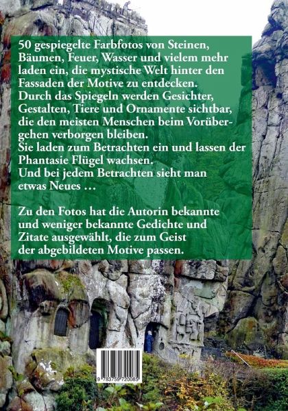 50 gespiegelte Farbfotos von Steinen, Bäumen, Feuer, Wasser und ielem mehr laden ein, die mystische Welt hinter den Fassaden der Motive zu entdecken. Durch das Spiegeln werden Gesichter, Gestalten, Tiere und Ornamente sichtbar, die den meisten Menschen beim Vorübergehen verborgen bleiben.
