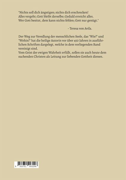 "Nichts soll dich ängstigen; nichts dich erschrecken! Alles vergeht; Gott bleibt derselbe; Geduld erreicht alles. Wer Gott besitzt, dem kann nichts fehlen; Gott nur genügt." - Teresa von Avila. Der Weg zur Veredlung der menschlichen Seele, das "Wie?" und "Wohin?" hat die heilige Autorin vor über 450 Jahren in ausführlichen Schriften dargelegt, welche in dem vorliegenden Band vereinigt sind. Vom Geist der ewigen Wahrheit erfüllt, sollen sie auch heute dem suchenden Christen als Leitung zur liebenden Gottheit dienen. In diesem Buch sind enthalten: 1. Die Seelenburg. 2. Gedanken über die Liebe Gottes. 3. Rufe der Seele zu Gott. 4. Weg der Vollkommenheit. 5. Leitsätze und Denksprüche. 6. Ermahnungen.