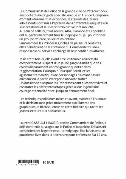 Le Commissariat de Police de la grande ville de Pétaouchnock s'est doté d'une brigade spéciale, unique en France. Composée d'enfants durement sélectionnés, les talents des jeunes adolescents sont mis à l'épreuve dans différentes enquêtes où leur créativité et leur esprit d'initiative font mouche. Au sein de celle-ci, trois soeurs, Alba, Garance et Léopoldine ont su particulièrement tirer leur épingle du jeu pour former un groupe efficace, solide et volontaire.Surnommées les Princesses, riches de plusieurs réussites, elles bénéficient de la confiance du Commandant Pinou, responsable du service et chargé de leur confier les affaires.Mais cette fois-ci, elles vont être les témoins directs des agissements suspects d'un jeune garçon tandis que des chiens disparaissent en trop grande quantité dans l'agglomération. Pourquoi? Pour qui? Serait-ce les agissements maléfiques de personnages n'aimant pas les animaux ou la partie émergée d'un vaste trafic?Un dossier de plus pour les Princesses dont elles vont vivre et constater les différentes étapes grâce à leur ingéniosité, courage et ténacité et ce, jusqu'au dénouement final.Les techniques policières mises en avant, mariées à l'humour et la dérision sont grâce notamment aux illustrations graphiques, le fil conducteur de cette histoire qui ravira les jeunes lecteurs aux plus assidus.
