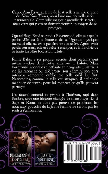 Carrie Ann Ryan, auteure de best-sellers au classement du New York Times, nous livre une nouvelle série paranormale. Cette ville magique grouille de secrets, mais ceux qui y vivent doivent trouver un moyen de se protéger. Quand Sage Reed se rend à Ravenwood, elle sait que la petite ville est à la hauteur de sa légende mystique, même si elle ne croit pas être une sorcière. Après avoir perdu son mari, elle est prête à changer, et la librairie de sa tante lui offre l'occasion idéale. Rome Baker a ses propres secrets, dont certains sont même cachés dans cette ville où il habite. Mais lorsqu'une inconnue stupéfiante et intrigante lui sauve la vie au moment où elle croise son chemin, son ours intérieur comprend qu'elle est celle qu'il lui faut. Néanmoins, comme la ville est attaquée, il craint de manquer de temps pour lui montrer ce qu'ils peuvent partager. Un nouvel ennemi se profile à l'horizon, tapi dans l'ombre, avec une histoire chargée de mensonges. Et si Sage et Rome ne font pas preuve de prudence, les nouveaux pouvoirs de la jeune femme ne seront pas les seuls à s'enflammer.