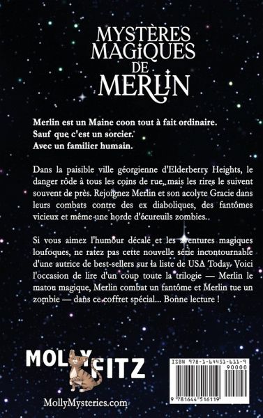Merlin est un Maine coon tout à fait ordinaire. Sauf que c'est un sorcier. Avec un familier humain. Dans la paisible ville géorgienne d'Elderberry Heights, le danger rôde à tous les coins de rue, mais les rires le suivent souvent de près. Rejoignez Merlin et son acolyte Gracie dans leurs combats contre des ex diaboliques, des fantômes vicieux et même une horde d'écureuils zombies. Si vous aimez l'humour décalé et les aventures magiques loufoques, ne ratez pas cette nouvelle série incontournable d'une autrice de best-sellers sur la liste de USA Today. Voici l'occasion de lire d'un coup toute la trilogie - Merlin affronte un familier, Merlin combat un fantôme et Merlin tue un zombie - dans ce coffret spécial... Bonne lecture !
