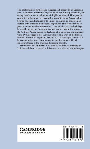 The employment of mythological language and imagery by an Epicurean poet - a professed adherent of a system which was not only materialist, but overtly hostile to myth and poetry - is highly paradoxical. This apparent contradiction has often been ascribed to a conflict in the poet's personality, between reason and intellect, or to a desire to enliven his philosophical material with attractive mythological digressions. This book attempts to provide a more positive assessment of Lucretius' aims and methodology, by considering the poet's attitude to myth, and the role which it plays in the De Rerum Natura, against the background of earlier and contemporary views. Dr Gale suggests that Lucretius was not only aware of the tension between his two roles as philosopher and poet, but attempted to resolve it by developing his own, Epicurean poetic, together with a bold and innovative theory of the origins and meaning of myth. This book will be of interest to all classical scholars but especially to those concerned with Lucretius and with ancient philosophy.