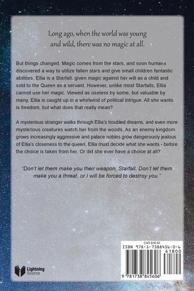 Long ago, when the world was young and wild, there was no magic at all. But things changed. Magic comes from the stars, and soon humans discovered a way to utilize fallen stars and give small children fantastic abilities. Ellia is a Starfall, given magic against her will as a child and sold to the Queen as a servant. However, unlike most Starfalls, Ellia cannot use her magic. Viewed as useless by some, but valuable by many, Ellia is caught up in a whirlwind of political intrigue. All she wants is freedom, but what does that really mean? A mysterious stranger walks through Ellia's troubled dreams, and even more mysterious creatures watch her from the woods. As an enemy kingdom grows increasingly aggressive and palace nobles grow dangerously jealous of Ellia's closeness to the queen, Ellia must decide what she wants - before the choice is taken from her. Or did she ever have a choice at all?