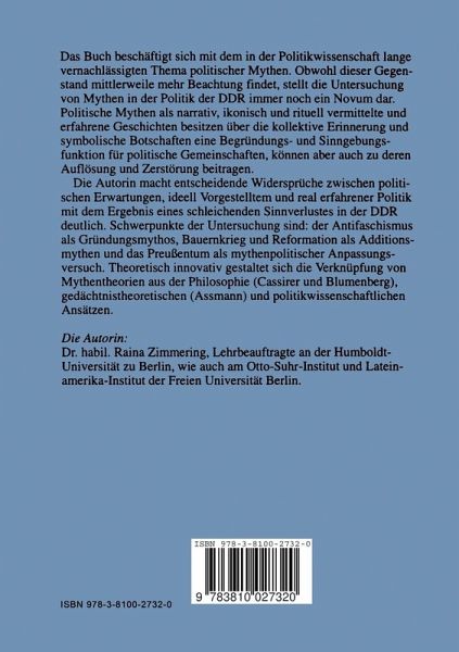 Die landläufige Meinung ordnete lange Zeit den Mythos, dem etwas Irrationales anhafte, der Rechten und die rationale Aufklärung der Linken zu. Raina Zimmering widerspricht dieser Auffassung und untersucht die Ideologie des SED-Staates als Mythenerzählung. Sie kommt zu dem Ergebnis, daß die SED-Herrschaft trotz aller Suche nach dem Urgrund ihrer staatlichen Sonderexistenz am Ende kein "DDR-Volk" hervorgebracht hat. "Es existierte lediglich die Zuweisung eines Staates an ein Teilvolk durch die Siegermächte nach dem Zweiten Weltkrieg" und ein "Kunstmythos", der nie volkseigen wurde. Die Autorin analysiert das anhand von drei zentralen Selbstlegitimationen des SED-Regimes: dem antifaschistischen "Gründungsmythos der DDR", der Beanspruchung von Bauernkriegen und Reformation als Vorgeschichte der DDR sowie dem Preußenmythos, der sich vom anfänglichen Negativbild zum Element der Identitätsstiftung gewandelt hat.