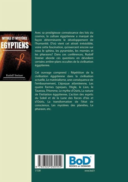 Avec sa prodigieuse connaissance des lois du cosmos, la culture égyptienne a marqué de façon déterminante le développement de l'humanité. D'où vient cet attrait irrésistible, voire cette fascination, qu'exercent encore sur nous le sphinx, les pyramides, les momies et les pharaons? Dans ces conférences, Rudolf Steiner aborde ces questions en dévoilant certains arrière-plans occultes de la civilisation égyptienne.Cet ouvrage comprend : Répétition de la civilisation égyptienne dans la civilisation actuelle, Le matérialisme, une conséquence de l'embaumement, L'époque atlantéenne, Les quatre formes typiques, l'Aigle, le Lion, le Taureau, l'Homme, Le mythe d'Osiris, La nature de l'initiation égyptienne, L'action des esprits du Soleil et de la Lune des forces d'Isis et d'Osiris, La transformation de l'état de conscience, Les mystères des planètes, Le pharaon, etc.