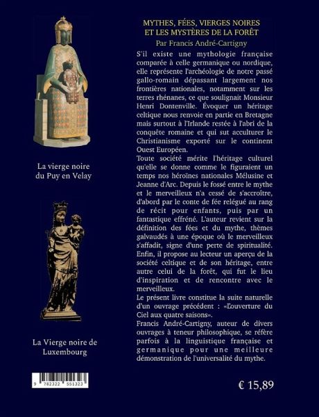 S'il existe une mythologie française comparée à celle germanique ou nordique, elle représente l'archéologie de notre passé gallo-romain dépassant largement nos frontières nationales, notamment sur les terres rhénanes, ce que soulignait Monsieur Henri Dontenville. Évoquer un héritage celtique nous renvoie en partie en Bretagne, mais surtout à l'Irlande restée à l'abri de la conquête romaine et qui sut acculturer le Christianisme exporté sur le continent Ouest Européen. Toute société mérite l'héritage culturel qu'elle se donne comme le figuraient un temps nos héroïnes nationales Mélusine et Jeanne d'Arc. Depuis le fossé entre le mythe et le merveilleux n'a cessé de s'accroître, d'abord par le conte de fée relégué au rang de récit pour enfants, puis un fantastique effréné. L'auteur revient sur la définition des fées et du mythe, thèmes galvaudés à une époque où le merveilleux s'affadit, signe d'une perte de spiritualité. Enfin, après les vierges noires, il propose au lecteur un aperçu de la société celtique et des son héritage, entre autre celui de la forêt, qui fut le lieu d'inspiration et de rencontre avec le merveilleux. Le présent livre constitue la suite naturelle d'un ouvrage précédent: "L'Ouverture du Ciel aux Quatre Saisons".