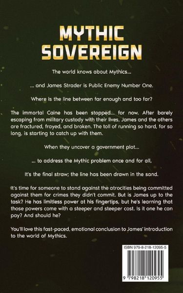 The world knows about Mythics... ... and James Strader is Public Enemy Number One. Where is the line between far enough and too far? The immortal Caine has been stopped... for now. After barely escaping from military custody with their lives, James and the others are fractured, frayed, and broken. The toll of running so hard, for so long, is starting to catch up with them. When they uncover a government plot... ... to address the Mythic problem once and for all, It's the final straw; the line has been drawn in the sand. It's time for someone to stand against the atrocities being committed against them for crimes they didn't commit. But is James up to the task? He has limitless power at his fingertips, but he's learning that those powers come with a steeper and steeper cost. Is it one he can pay? And should he? You'll love this fast-paced, emotional conclusion to James' introduction to the world of Mythics.