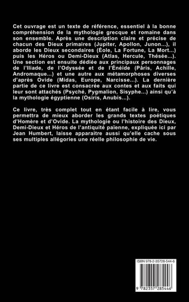 Cet ouvrage est un texte de référence, essentiel à la bonne compréhension de la mythologie grecque et romaine dans son ensemble. Après une description claire et précise de chacun des Dieux primaires (Jupiter, Apollon, Junon...), il aborde les Dieux secondaires (Éole, La Fortune, La Mort...) puis les Héros ou Demi-Dieux (Atlas, Hercule, Thésée...). Une section est ensuite dédiée aux principaux personnages de l'Iliade, de l'Odyssée et de l'Énéide (Pâris, Achille, Andromaque...) et une autre aux métamorphoses diverses d'après Ovide (Midas, Europe, Narcisse...). La dernière partie de ce livre est consacrée aux contes et aux faits qui leur sont attachés (Psyché, Pygmalion, Sisyphe...) ainsi qu'à la mythologie égyptienne (Osiris, Anubis...). Ce livre, très complet tout en étant facile à lire, vous permettra de mieux aborder les grands textes poétiques d'Homère et d'Ovide. La mythologie ou l'histoire des Dieux, Demi-Dieux et Héros de l'antiquité païenne, expliquée ici par Jean Humbert, laisse apparaitre aussi qu'elle cache sous ses multiples allégories une réelle philosophie de vie. La poésie anima ainsi toute la nature, et peupla le monde d'êtres fantastiques ; et comme le dit élégamment Boileau :Chaque vertu devient une divinité :Minerve est la prudence, et Vénus la beauté...Écho n'est plus un son qui dans l'air retentisse,C'est une nymphe en pleurs qui se plaint de Narcisse. Quoique la mythologie soit presque un tissu continuel de fables, elle ne laisse pas d'avoir une incontestable utilité. Elle nous met en état d'expliquer, en les admirant, les chefs-d'uvre des peintres et des sculpteurs ; elle rend facile et intéressante la lecture des poètes ; elle éclaircit l'histoire des nations païennes ; elle fait connaître dans quelles ténèbres étaient plongés les Égyptiens, les Grecs, les Romains, et à quel degré d'égarement peut arriver l'homme, abandonné à ses seules et faibles lumières. Sans doute une grande partie des fables qui la composent sont invraisemblables et absurdes : des dieux boiteux, aveugles, matériels, se battant entre eux ou contre les hommes ; des dieux pauvres, exilés du ciel et obligés d'embrasser sur la terre la profession de maçon ou de berger, doivent paraître ridicules. Mais la mythologie offre çà et là des fables morales, où l'on trouve, sous le voile de l'allégorie, d'excellents préceptes et des règles de conduite.