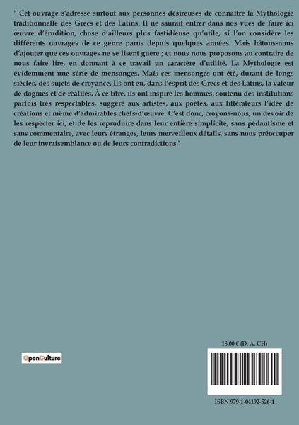 " Cet ouvrage s¿adresse surtout aux personnes désireuses de connaître la Mythologie traditionnelle des Grecs et des Latins. Il ne saurait entrer dans nos vues de faire ici ¿uvre d¿érudition, chose d¿ailleurs plus fastidieuse qüutile, si l¿on considère les différents ouvrages de ce genre parus depuis quelques années. Mais hâtons-nous d¿ajouter que ces ouvrages ne se lisent guère ; et nous nous proposons au contraire de nous faire lire, en donnant à ce travail un caractère d¿utilité. La Mythologie est évidemment une série de mensonges. Mais ces mensonges ont été, durant de longs siècles, des sujets de croyance. Ils ont eu, dans l¿esprit des Grecs et des Latins, la valeur de dogmes et de réalités. À ce titre, ils ont inspiré les hommes, soutenu des institutions parfois très respectables, suggéré aux artistes, aux poètes, aux littérateurs l¿idée de créations et même d¿admirables chefs-d¿¿uvre. C¿est donc, croyons-nous, un devoir de les respecter ici, et de les reproduire dans leur entière simplicité, sans pédantisme et sans commentaire, avec leurs étranges, leurs merveilleux détails, sans nous préoccuper de leur invraisemblance ou de leurs contradictions."