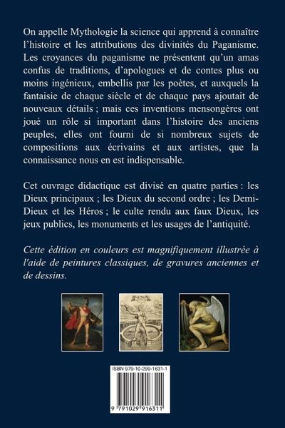 On appelle Mythologie la science qui apprend à connaître l'histoire et les attributions des divinités du Paganisme. Les croyances du paganisme ne présentent qu'un amas confus de traditions, d'apologues et de contes plus ou moins ingénieux, embellis par les poètes, et auxquels la fantaisie de chaque siècle et de chaque pays ajoutait de nouveaux détails ; mais ces inventions mensongères ont joué un rôle si important dans l'histoire des anciens peuples, elles ont fourni de si nombreux sujets de compositions aux écrivains et aux artistes, que la connaissance nous en est indispensable. Cet ouvrage didactique est divisé en quatre parties : les Dieux principaux ; les Dieux du second ordre ; les Demi-Dieux et les Héros ; le culte rendu aux faux Dieux, les jeux publics, les monuments et les usages de l'antiquité. Cette édition en couleurs est magnifiquement illustrée à l'aide de peintures classiques, de gravures anciennes et de dessins.