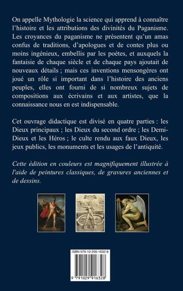 On appelle Mythologie la science qui apprend à connaître l'histoire et les attributions des divinités du Paganisme. Les croyances du paganisme ne présentent qu'un amas confus de traditions, d'apologues et de contes plus ou moins ingénieux, embellis par les poètes, et auxquels la fantaisie de chaque siècle et de chaque pays ajoutait de nouveaux détails ; mais ces inventions mensongères ont joué un rôle si important dans l'histoire des anciens peuples, elles ont fourni de si nombreux sujets de compositions aux écrivains et aux artistes, que la connaissance nous en est indispensable. Cet ouvrage didactique est divisé en quatre parties : les Dieux principaux ; les Dieux du second ordre ; les Demi-Dieux et les Héros ; le culte rendu aux faux Dieux, les jeux publics, les monuments et les usages de l'antiquité. Cette édition en couleurs est magnifiquement illustrée à l'aide de peintures classiques, de gravures anciennes et de dessins.