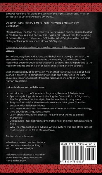 Empires rose and fell along the banks of the Tigris & Euphrates, whilst a civilization as yet unsurpassed emerged... Discover Myths, History & More From The World's Most Ancient Civilization! Mesopotamia, the land "between two rivers" was an ancient region located in modern-day Iraq and parts of Iran, Syria, and Turkey. From the founding of Eridu in the sixth millennium BCE to the fall of Babylon in the first, the history of Mesopotamia spans almost 5,000 years. It was not only the earliest but also the greatest civilization in human history. Sumerians, Assyrians, Akkadians, and Babylonians were just some of the associated cultures. For a long time, the only way to understand their history has been through dense academic sources. This is in part due to the huge time frame and the lack of easily understood ancient sources. Such inaccessibility of information means that few know little about it. As such, it is essential to bring their knowledge and history into the light, allowing everyone to benefit from the fascinating insights of the very first human civilization. Inside this book you will discover;Introduction to the Sumerians, Assyrians, Persians & Babylonians. Epics & mythological stories, including the famous Epic of Gilgamesh, The Babylonian Creation Myth, The Enuma Elish & many more. Sargon of Akkad (Saddam Hussein celebrated this great Akkadian emperor with lavish festivities) How Mesopotamia laid foundations for human civilization - technology, laws, education, languages & more. Learn about civilizations such as The Land of Ur (home to Biblical characters) Old Babylon - fascinating insights from one of the most famous ancient cities. Why the introduction of a syllabic writing system was one of the largest contributors to the fall of Mesopotamia. And much, much more... Whether you're an ancient history enthusiast or just a reader looking to add to their knowledge...Inside you will discover a wealth of cultural history, mythology and more from in this book.