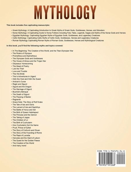 If you want a huge collection of the best myths and discover captivating stories of gods, goddesses, monsters and mortals, then keep reading... This book includes five captivating manuscripts: Greek Mythology: A Captivating Introduction to Greek Myths of Greek Gods, Goddesses, Heroes, and Monsters Norse Mythology: A Captivating Guide to Norse Folklore Including Fairy Tales, Legends, Sagas and Myths of the Norse Gods and Heroes Egyptian Mythology: Captivating Egyptian Myths of Egyptian Gods, Goddesses, and Legendary Creatures Celtic Mythology: Captivating Celtic Myths of Celtic Gods, Goddesses, Heroes and Legendary Creatures Roman Mythology Captivating Roman Myths of Roman Gods, Goddesses, Heroes and Mythological Creatures In the first part of this book, you'll find the following Greek myths and topics covered In The Beginning: The Creation of the World, and the Titan-Olympian War The Rulers of Olympus Prometheus and Epimetheus The Birth of the Muses The Olympian Gods and Goddesses The House of Atreus and the Trojan War Odysseus' Long Way Home Odysseus' Homecoming Agamemnon's Homecoming and Orestes' Choice Oedipus and the Prophecies Oedipus' Children Cupid and Psyche Short Tales And Many More In the second part of this book, you'll find the following Norse myths and topics covered The Creation of the Worlds The Building of Asgard Why Odin Has One Eye and Tyr Has One Hand The Mead of Poetry Loki the Thief Love and Trouble Thor the Bride Thor's Adventures in Utgard Odin the Host and Odin the Guest Andvari's Curse Regin and Sigurd Sigurd and the Dragon The Marriage of Sigurd Brynhild's Betrayal The Death of Sigurd The Passing of Balder Ragnarök Grace Note: The Story of Rolf Krake In the third part of this book, you'll find the following Egyptian myths and topics covered Creation Myths The Birth of Osiris The Tale of Isis and Osiris The Lament of Isis and Nephthys The Battle of Horus and Set The Birth of Queen Hatshepsut The Tale of the Famine The Shipwrecked Sailor The Two Brothers The Princess and the Demon The Taking of Joppa Two Tales of Setne Khamwas In the fourth part of this book, you'll find the following Celtic myths and topics covered The Children of Lir The Birth of Cuchulainn How Cuchulainn Got His Name Pwyll, Prince of Dyfed The Story of Culhwch and Olwen The Romance of Tristan and Iseult And more! In the fifth part of this book, you'll find the following Roman myths and topics covered The Wanderings of Aeneas The Story of the Founding of Rome The Rape of Lucretia Hercules and the Giant of Latium The Quest for the Golden Fleece The Creation of the World And many more! So if you want to learn more about these five mythologies, click "Add to Cart"!