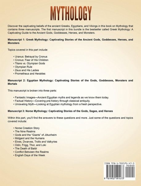 Mythology Discover the captivating beliefs of the ancient Greeks, Egyptians, and Vikings in this book on Mythology that contains three manuscripts. The first manuscript in this bundle is the bestseller called Greek Mythology: A Captivating Guide to the Ancient Gods, Goddesses, Heroes, and Monsters. Manuscript 1: Greek Mythology: Captivating Stories of the Ancient Gods, Goddesses, Heroes, and Monsters By the time you are finished with this part, you will have a good appreciation for the nature of Greek mythology and the gods, monsters, and heroes which populate it. Just some of the topics covered in this part include: Uranus: Betrayal by Cronus Cronus: Fear of His Children Titans vs. Olympian Gods Olympian Rule Zeus and His Ladies Prometheus and Herakles An Unhappy Tale of the Underworld The Beauty Contest that Led to the Fall of Troy Poseidon, Metis, Athena and Atlantis Kraken and Other Monsters Jason, the Argonauts, and Medea's Dragon Menelaus, Agamemnon, and the Trojan War Solon, the Athenian Law Giver 300 Spartans Socrates, Plato, and Aristotle Alexander the Great Manuscript 2: Egyptian Mythology: Captivating Stories of the Gods, Goddesses, Monsters and Mortals This manuscript is broken into three parts: Fantastic Images—Ancient Egyptian myths and legends as we know them today. Factual History—Covering pre-history through classical antiquity. Unraveling Myth—Looking at Egyptian mythology from a fresh perspective. This part is jam-packed with fascinating facts and stories. For instance, it covers perhaps the most popular of all the Egyptian stories - the myth of Osiris. Pieces of this story have been found throughout Egypt. One of the most appealing aspects of the Osiris myth is the human-like behavior of the gods within the story. Many of the other gods of the Egyptian pantheon were rather emotionless and their stories far less interesting. With the Osiris story, the gods display a broad range of emotions that made them more real to mere mortals. Just some of the questions and topics covered in this manuscript on Egyptian Mythology include: Egypt in Context Creation Fall of Humanity Osiris Myth Chief Gods of the Egyptian Pantheon Lesser Known Pantheon Ancient Egyptian History Manuscript 3: Norse Mythology: Captivating Stories of the Gods, Sagas, and Heroes Within this part, you'll find the answers to these questions and more. Just some of the questions and topics covered include: Norse Creation Story The Nine Realms Gods and the "Giants" of Jötunheim Midgard and the Humans Elves, Dwarves, Trolls and Valkyries Odin, Frigg, Thor, and Loki The Death of Baldr Conflict Between the Realms English Days of the Week And more! Buy this magnificent mythology book now to learn more about greek mythology, egyptian mythology and norse mythology