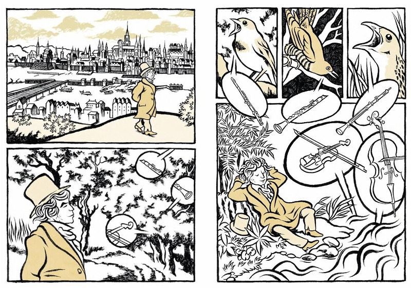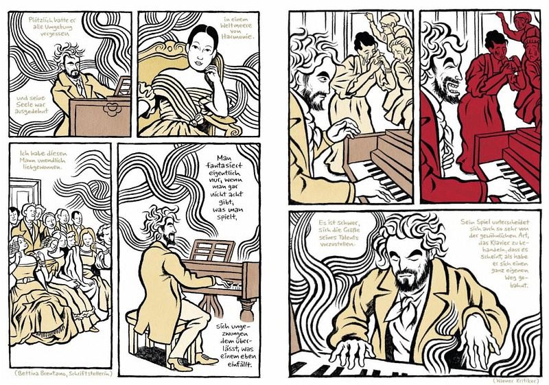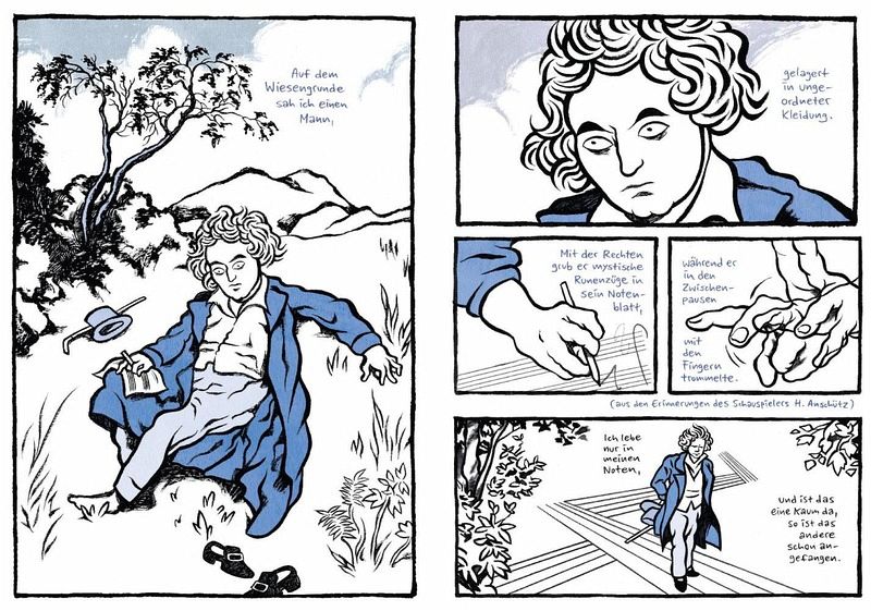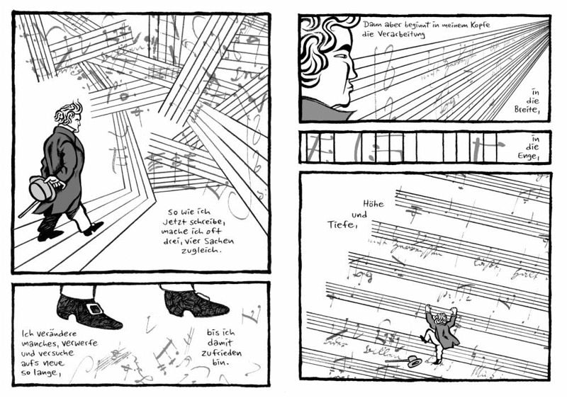 In dieser episodenhaft erzählten Graphic Novel betrachtet Moritz Stetter das Leben des musikalischen Genies auf eine ungewöhnliche und eindrucksvolle Weise. Ganz nach dem Rhythmus Beethovens gestaltet, erkundet die Erzählung in ausgewählten Episoden wichtige Stationen des Komponisten. Sein überragendes Talent und seine Beliebtheit beim Publikum werden ebenso thematisiert wie seine Überheblichkeit gegenüber seinen Zeitgenossen und Gönnern und der allmähliche Verlust seines Gehörs. Gleichzeitig wird aber auch die Rezeption von Beethovens Werk nach seinem Tod behandelt sowie das ikonenhafte "Beethoven-Künstlerbild" hinterfragt.