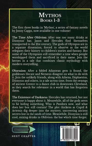 The first three books in 'Mythos', a series of fantasy novels by Jonny Capps, now available in one volume! The Time After Oblivion: After one too many drinks at Dionysus' bar, Jason and Hercules find themselves transported to the 21st century. The gods of Olympus are in a separate dimension, forced to observe as the world relegates their history to children's stories and fantasy. But some of the Olympians still remember a time when people worshipped them and sacrificed in their name. Join the heroes in a tale that combines classic mythology with modern storytelling. Obsession: After a fabled Atlantean gem is found, the goddesses Hecate and Nemesis disagree on what to do with it. Join the unlikely friends, along with Athena, Hephaestus, Dionysus and others, in a tale across time, from the swamps of ancient Greece to a dance club in downtown Cleveland, as they search for relevance in a world that has forgotten them. The Existence of Darkness: Hercules has returned, but not everyone is happy about it. Meanwhile, all of the gods seem to be hiding something. Who is Pandora now, and what does her box still contain? The plot thickens as Cupid & Artemis dig deeper into the mystery, uncovering ancient secrets lost in the sands of time. Meanwhile, Dionysus is still cool, mixing drinks in Oblivion: the bar which time forgot.