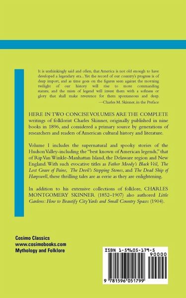 It is unthinkingly said and often, that America is not old enough to have developed a legendary era... Yet the record of our country's progress is of deep import, and as time goes on the figures seen against the morning twilight of our history will rise to more commanding stature, and the mists of legend will invest them with a softness or glory that shall make reverence for them spontaneous and deep. -Charles M. Skinner, in the Preface Here in two concise volumes are the complete writings of folklorist Charles Skinner, originally published in nine books in 1896, and considered a primary source by generations of researchers and readers of American cultural history and literature. Volume 1 includes the supernatural and spooky stories of the Hudson Valley-including the "best known of American legends," that of Rip Van Winkle-and Manhattan Island, the Delaware region and New England. With such evocative titles as "Father Moody's Black Veil," "The Lost Grave of Paine," "The Devil's Stepping Stones," and "The Dead Ship of Harpswell," these thrilling tales are as eerie as they are enlightening. AUTHOR BIO: In addition to his extensive collections of folklore, CHARLES MONTGOMERY SKINNER (1852-1907) also authored Little Gardens: How to Beautify City Yards and Small Country Spaces (1904).
