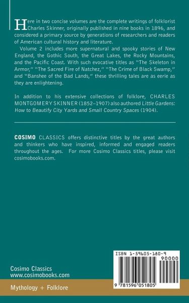 Here in two concise volumes are the complete writings of folklorist Charles Skinner, originally published in nine books in 1896, and considered a primary source by generations of researchers and readers of American cultural history and literature. Volume 2 includes more supernatural and spooky stories of New England, the Gothic South, the Great Lakes, the Rocky Mountains, and the Pacific Coast. With such evocative titles as "The Skeleton in Armor," "The Sacred Fire of Natchez," "The Crime of Black Swamp," and "Banshee of the Bad Lands," these thrilling tales are as eerie as they are enlightening. In addition to his extensive collections of folklore, CHARLES MONTGOMERY SKINNER (1852-1907) also authored Little Gardens: How to Beautify City Yards and Small Country Spaces (1904).