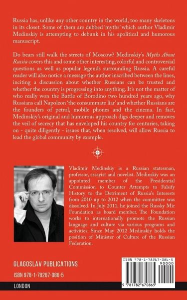 Russia's rich history is full of secrets: there's not another country in the world with so many skeletons in its closet. Vladimir Medinskiy's new book offers the reader the opportunity to get better acquainted with some myths about Russia in an quick, easy and entertaining way. The book covers some of the most interesting, colourful and controversial debates in Russian history and the most popular myths about Russia: vodka and its role in some incredible adventures, Russia's problems (apart from the roads and having too many fools), some lessons from the Bastille and the Civil War, the last testament of Peter the Great, amongst many others. In his book the author tackles some of the most pressing questions about Russia: whether you can trust Russians, the meaning of progress in Russian terms, who really won at the Battle of Borodino two hundred years ago, why Russians call Napoleon 'the consummate liar', and also whether Russians are the true originators of petrol, mobile phones and the cinema. Myths About Russia is Medinskiy's original and humorous take on the subject: in this book, he diligently unravels the myths surrounding this vast and complex nation, picking them apart to uncover the truth about Russia and her fascinating history.