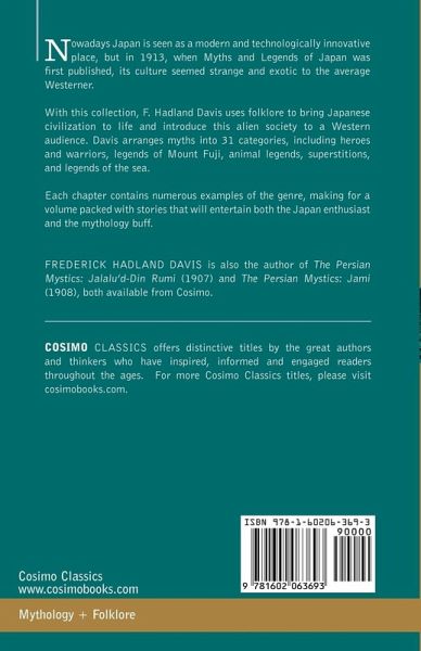 Nowadays Japan is seen as a modern and technologically innovative place, but in 1913, when Myths and Legends of Japan was first published, its culture seemed strange and exotic to the average Westerner. With this collection, F. Hadland Davis uses folklore to bring Japanese civilization to life and introduce this alien society to a Western audience. Davis arranges myths into 31 categories, including heroes and warriors, legends of Mount Fuji, animal legends, superstitions, and legends of the sea. Each chapter contains numerous examples of the genre, making for a volume packed with stories that will entertain both the Japan enthusiast and the mythology buff. FREDERICK HADLAND DAVIS is also the author of The Persian Mystics: Jalalu'd-Din Rumi (1907) and The Persian Mystics: Jami (1908), both available from Cosimo.