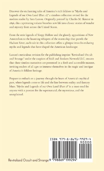 Discover the enchanting tales of America's rich folklore in "Myths and Legends of our Own Land (Part 1)," a timeless collection revised for the modern reader by Sara Larson. Originally penned by Charles M. Skinner in 1896, this captivating volume breathes new life into classic stories of wonder and mystery from across the United States. From the eerie legends of Sleepy Hollow and the ghostly apparitions of New Amsterdam to the haunting whispers of the storm ship that prowls the Hudson River, each tale in this collection offers a glimpse into the enduring myths and legends that have shaped the American landscape. Larson's meticulous revision for the publishing imprint "Revitalized Occult and Strange," under the auspices of Bald and Bonkers Network LLC, ensures that these timeless narratives are presented in a fresh and accessible manner, inviting readers of all ages to immerse themselves in the magic and intrigue of America's folklore heritage. Prepare to embark on a journey through the heart of America's mythical past, where legends come to life and the line between reality and fantasy blurs. "Myths and Legends of our Own Land (Part 1)" is a must-read for anyone with a passion for the supernatural, the mysterious, and the unexplained.