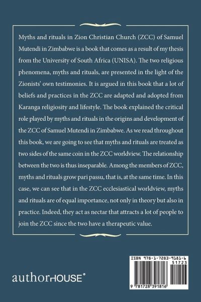 Myths and rituals in Zion Christian Church (ZCC) of Samuel Mutendi in Zimbabwe is a book that comes as a result of my thesis from the University of South Africa (UNISA). The two religious phenomena, myths and rituals, are presented in the light of the Zionists' own testimonies. It is argued in this book that a lot of beliefs and practices in the ZCC are adapted and adopted from Karanga religiosity and lifestyle. The book explained the critical role played by myths and rituals in the origins and development of the ZCC of Samuel Mutendi in Zimbabwe. As we read throughout this book, we are going to see that myths and rituals are treated as two sides of the same coin in the ZCC worldview. The relationship between the two is thus inseparable. Among the members of ZCC, myths and rituals grow pari passu, that is, at the same time. In this case, we can see that in the ZCC ecclesiastical worldview, myths and rituals are of equal importance, not only in theory but also in practice. Indeed, they act as nectar that attracts a lot of people to join the ZCC since the two have a therapeutic value.