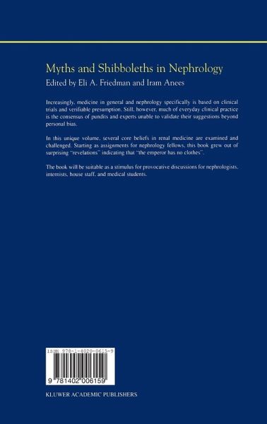 Myths and Shibboleths.- 1. Urinary tract infection can lead to end stage renal disease (ESRD).- 2. Kidney donation does not jeopardize function in the remaining kidney.- 3. Hypertension imposes a risk of chronic kidney failure.- 4. Angiotensin converting enzyme inhibitors (ACEi) are superior to other antihypertensive drugs because of their renoprotective properties.- 5. Dietary protein restriction slows progression of renal insufficiency.- 6. Plasmapheresis is beneficial in some renal disorders.- 7. Urinary tract infection is more prevalent in diabetes.- 8. Type 1 diabetes is more likely than type 2 diabetes to lead to nephropathy and ESRD.- 9. Pharmacological strategies may prevent acute tubular necrosis (ATN).- 10. Intravenous iron may be hazardous in infected hemodialysis patients.- 11. Peritoneal dialysis is equivalent to hemodialysis.- 12. Rationing of ESRD treatment is an unavoidable reality.- 13. Tacrolimus is superior to cyclosporine in renal transplantation.- 14. Dialyzer re-use is safe and cost effective.- 15. Living related pancreas after kidney transplantation is preferable to cadaveric simultaneous pancreas-kidney transplantation.- 16. Administration of active vitamin D metabolites is beneficial in patients with advanced chronic renal failure (pre end-stage renal disease).- 17. Surgical intervention and prompt nephrectomy are preferred in emphysematous pyelonephritis.- 18. Mortality in chronic hemodialysis is greater in the U.S. than in Europe and Japan.- 19. A single hemodialysis treatment prevents uremic bleeding and restores platelet function.- 20. Kidney biopsy is indicated in every case of lupus nephritis.- 21. Indicators of glycemic control in diabetic ESRD patients should be equivalent to those utilized in earlier stages of diabetic nephropathy.- 22.Fish oil is effective therapy for IgA nephropathy.- 23. Physician assistants should replace nephrologists in dialysis units.- 24. Patients with severe cerebrovascular accidents (CVA) require long-term bladder catheters.- 25. Pre-transplant blood transfusions enhance renal allograft survival.- 26. Hemoperfusion is superior to hemodialysis in the treatment of certain poisonings and/or drug overdoses.- Epilogue.