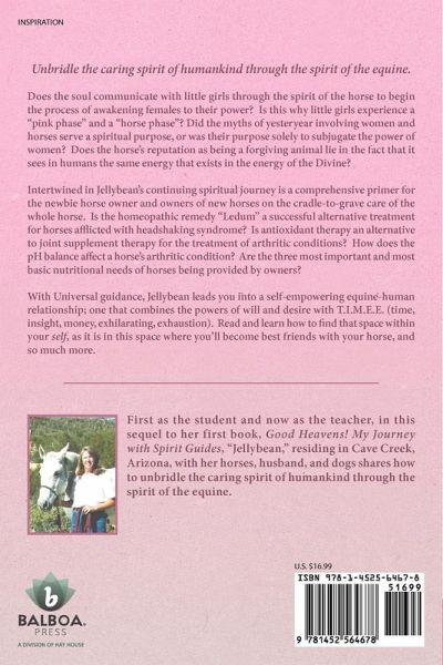 Unbridle the caring spirit of humankind through the spirit of the equine. Does the soul communicate with little girls through the spirit of the horse to begin the process of awakening females to their power? Is this why little girls experience a "pink phase" and a "horse phase"? Did the myths of yesteryear involving women and horses serve a spiritual purpose, or was their purpose solely to subjugate the power of women? Does the horse's reputation as being a forgiving animal lie in the fact that it sees in humans the same energy that exists in the energy of the Divine? Intertwined in Jellybean's continuing spiritual journey is a comprehensive primer for the newbie horse owner and owners of new horses on the cradle-to-grave care of the whole horse. Is the homeopathic remedy "Ledum" a successful alternative treatment for horses afflicted with headshaking syndrome? Is antioxidant therapy an alternative to joint supplement therapy for the treatment of arthritic conditions? How does the pH balance affect a horse's arthritic condition? Are the three most important and most basic nutritional needs of horses being provided by owners? With Universal guidance, Jellybean leads you into a self-empowering equine-human relationship; one that combines the powers of will and desire with T.I.M.E.E. (time, insight, money, exhilarating, exhaustion). Read and learn how to find that space within your self, as it is in this space where you'll become best friends with your horse, and so much more.