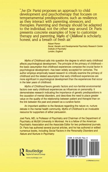 Childhood has long been considered the major factor in determining adult life. It sets us on the path toward or away from happiness, shapes our personality, and is a major cause of mental disorders. Or is it? Myths of Childhood strongly challenges these assumptions usually taken for granted in contemporary society and the mental health community. With a healthy dose of scepticism toward clinical impressions and using empirically-based research from areas including behavioral genetics and attachment, Dr. Paris builds a convincing case against the primacy of childhood in the development of adult personality and psychopathology. In its place, he offers an alternative model for development and shows how mental health professionals can apply this model to clinical pracitce. Myths of Childhood represents an important addition to the ongoing debate between mental health professionals regarding nature vs. nurture. For supporters of either side , this book is a valuable resource for further exploration of this controversy.