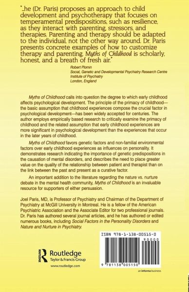 Childhood has long been considered the major factor in determining adult life. It sets us on the path toward or away from happiness, shapes our personality, and is a major cause of mental disorders. Or is it? Myths of Childhood strongly challenges these assumptions usually taken for granted in contemporary society and the mental health community. With a healthy dose of scepticism toward clinical impressions and using empirically-based research from areas including behavioral genetics and attachment, Dr. Paris builds a convincing case against the primacy of childhood in the development of adult personality and psychopathology. In its place, he offers an alternative model for development and shows how mental health professionals can apply this model to clinical pracitce. Myths of Childhood represents an important addition to the ongoing debate between mental health professionals regarding nature vs. nurture. For supporters of either side , this book is a valuable resource for further exploration of this controversy.