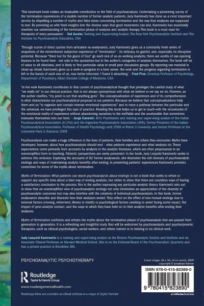 Myths of termination confronts and refutes the myths about the termination phase of psychoanalysis that are passed from generation to generation. It is a refreshing and insightful study that will be welcomed by psychoanalysts, psychodynamic therapists, such as clinical psychologists, social workers, and others trained or in training to do clinical work.