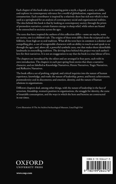 * Preface * Introduction * Part I: The Knowledge Narratives: Experience, Learning, and Truth * 1: Yiannis Gabriel: The Narrative Veil * 2: Silvia Gherardi: Knowing as Desire: Dante's Ulisse at the End of the Known World * 3: Peter Case: The Blind People and the Elephant * 4: Dimitris Kyrtatas: Heaven and Paradise: Western Ways of Perfect (Non)-Organization * Part II: The Heroic Narratives: Achievement, Leadership, and Power * 5: Keith Grint: Overcoming the Hydra: Leaderless Groups and Terrorism * 6: Robert French and Patrick Moore: Divided Neither in Life nor in Death: Friendship and Leadership in the Story of David and Jonathan * 7: Donncha Kavanagh and Majella O'Leary: The Legend of Cu Chulainn: Exploring Organization Theory's Heroic Odyssey * Part III: The Tragic Narratives: Postmodernity and its Discontents * 8: Peter Pelzer: The Flying Dutchman and the Discontents of Postmodernity * 9: Yvonne Guerrier: Arachne and Minerva: Women, Power, and Realization * 10: Ulrich Gehmann: Prometheus, the Quest for Knowledge and the Promise of Salvation through Technique * 11: Diana Winstanley: Phaethon, the Struggle for Identity, and the Reins of Power * 12: Heather Hopfl: The Hymn to Demeter: The Curse of Insatiable Consumption * Part IV: The Reflexive Narratives: Emotion, Identity, and the Nature of Relations in Organizations * 13: David Sims: The Velveteen Rabbit and the Emotional Construction of Organizations * 14: Tony Watson: Shy William and the Gaberlunzie Girl