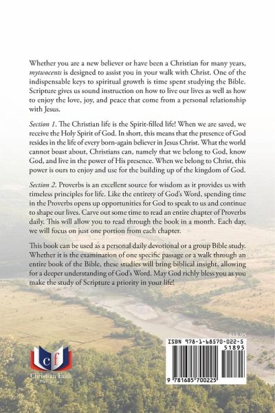 Whether you are a new believer or have been a Christian for many years, mytwocents is designed to assist you in your walk with Christ. One of the indispensable keys to spiritual growth is time spent studying the Bible. Scripture gives us sound instruction on how to live our lives as well as how to enjoy the love, joy, and peace that come from a personal relationship with Jesus.Section 1. The Christian life is the Spirit-filled life! When we are saved, we receive the Holy Spirit of God. In short, this means that the presence of God resides in the life of every born-again believer in Jesus Christ. What the world cannot boast about, Christians can, namely that we belong to God, know God, and live in the power of His presence. When we belong to Christ, this power is ours to enjoy and use for the building up of the kingdom of God.Section 2. Proverbs is an excellent source for wisdom as it provides us with timeless principles for life. Like the entirety of God's Word, spending time in the Proverbs opens up opportunities for God to speak to us and continue to shape our lives. Carve out some time to read an entire chapter of Proverbs daily. This will allow you to read through the book in a month. Each day, we will focus on just one portion from each chapter.This book can be used as a personal daily devotional or a group Bible study. Whether it is the examination of one specific passage or a walk through an entire book of the Bible, these studies will bring biblical insight, allowing for a deeper understanding of God's Word. May God richly bless you as you make the study of Scripture a priority in your life!
