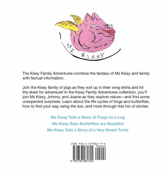 The Kissy Family Adventures combine the fantasy of Mz Kissy and family with factual information. Join the Kissy family of pigs as they suit up in their wing shirts and hit the skies for adventure! In the Kissy Family Adventures collection, you'll join Mz Kissy, Johnny, and Joanie as they explore nature-and find some unexpected surprises. Learn about the life cycles of frogs and butterflies, how to find your way using the sun, and more through this trio of stories: Mz Kissy Tells a Story of Frogs on a Log Mz Kissy Says Butterflies are Beautiful Mz Kissy Tells a Story of a Very Smart Turtle