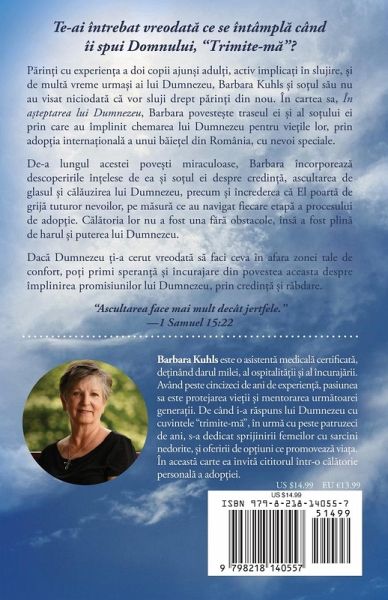 Te-ai întrebat vreodat¿ ce se întâmpl¿ când îi spui Domnului, "Trimite-m¿"? ¿¿¿¿P¿rin¿i cu experien¿¿ a doi copii ajun¿i adul¿i, activ implicäi în slujire, ¿i de mult¿ vreme urmäi ai lui Dumnezeu, Barbara Kuhls ¿i so¿ul s¿u nu au visat niciodat¿ c¿ vor sluji drept p¿rin¿i din nou. În cartea sa, În A¿teptare Dup¿ Dumnezeu, Barbara poveste¿te traseul ei ¿i al so¿ului ei prin care au împlinit chemarea lui Dumnezeu pentru vie¿ile lor, prin adop¿ia internäional¿ a unui b¿ie¿el cu nevoi speciale din România. ¿¿¿De-a lungul acestei pove¿ti miraculoase, Barbara încorporeaz¿ descoperirile în¿elese de ea ¿i so¿ul ei despre credin¿¿, ascultarea dup¿ glasul ¿i c¿l¿uzirea lui Dumnezeu, precum ¿i încrederea c¿ El poart¿ de grij¿ tuturor nevoilor, pe m¿sur¿ ce au navigat fiecare etap¿ a procesului de adop¿ie. C¿l¿toria lor nu a fost una f¿r¿ obstacole, îns¿ a fost plin¿ de harul ¿i puterea lui Dumnezeu. ¿¿Dac¿ ¿i-a cerut Dumnezeu vreodat¿ s¿ faci ceva în afara zonei tale de confort, po¿i primi speran¿¿ ¿i încurajare din povestea aceasta despre împlinirea promisiunilor lui Dumnezeu prin credin¿¿ ¿i r¿bdare. "Ascultarea face mai mult decât jertfele." -1 Samuel 15:22