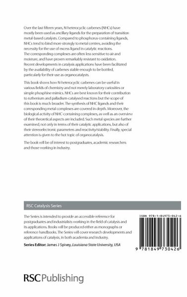 Over the last fifteen years, N-heterocyclic carbenes (NHCs) have mostly been used as ancillary ligands for the preparation of transition metal-based catalysts. Compared to phosphorus-containing ligands, NHCs tend to bind more strongly to metal centres, avoiding the necessity for the use of excess ligand in catalytic reactions. The corresponding complexes are often less sensitive to air and moisture, and have proven remarkably resistant to oxidation. Recent developments in catalysis applications have been facilitated by the availability of carbenes stable enough to be bottled, particularly for their use as organocatalysts. This book shows how N-heterocyclic carbenes can be useful in various fields of chemistry and not merely laboratory curiosities or simple phosphine mimics. NHCs are best known for their contribution to ruthenium and palladium-catalysed reactions but the scope of this book is much broader. The synthesis of NHC ligands and their corresponding metal complexes are covered in depth. Moreover, the biological activity of NHC-containing complexes, as well as an overview of their theoretical aspects are included. Such metal species are further examined, not only in terms of their catalytic applications, but also of their stereoelectronic parameters and reactivity/stability. Finally, special attention is given to the hot topic of organocatalysis. The book will be of interest to postgraduates, academic researchers and those working in industry.