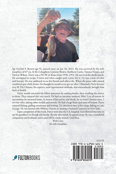 Sgt Harold T. Brown age 91, passed away on Jan 20, 2022. He was survived by his wife Josephine of 67 yrs, & his 4 daughters Lorraine Brown, Kathleen Curtis, Vanessa Noxon, and Patricia Wilson. Harry was a P.O.W. in Korea from 1950-1953. He survived the death march. He attempted to escape 3 times and when caught paid a price for it. He was a man of valor and bravery. He was saddened to see his friends and others die. When the peace talks started conditions got a little better. He thought he would never get out alive. Ultimately Harry became very ill. The Chinese, his captives, used experimental methods, that miraculously, brought him back to health. Harry would entertain his fellow prisoners by reading books, then retelling the stories to them. They enjoyed this very much. He had an uncanny memory. After 3 yrs of torture & uncertainty, he returned home. In honor of his service and deeds, he received 2 bronze stars, 1 w/v for valor, among other medals and awards. He had a huge heart and sense of humor. Harry enjoyed fishing, golfing astronomy and writing. He cherished time at his camp, fishing at Lake George. He was buried with Military Honors at Saratoga National Cemetery in New York. Upon completion of this book, Harry went into the V.A. hospital. God allowed him time to say his goodbye's to friends and family. Shortly afterwards, he passed away. He was a wonderful companion and husband, and is and will be surely missed. God bless. With Love, his wife Josephine