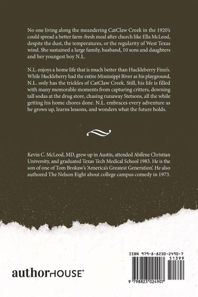 No one living along the meandering CatClaw Creek in the 1920's could spread a better farm-fresh meal after church like Ella McLeod, despite the dust, the temperatures, or the regularity of West Texas wind. She sustained a large family, husband, 10 sons and daughters and her youngest boy N.L. N.L. enjoys a home life that is much better than Huckleberry Finn's. While Huckleberry had the entire Mississippi River as his playground, N.L. only has the trickles of CatClaw Creek. Still, his life is filled with many memorable moments from capturing critters, downing tall sodas at the drug store, chasing runaway Stetsons, all the while getting his home chores done. N.L. embraces every adventure as he grows up, learns lessons, and wonders what the future holds.
