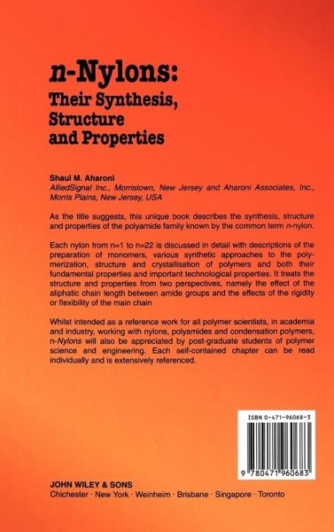 Aus dem Inhalt: PART I: Nomenclature and Fundamental Features; Thermodynamics; Crystallinity and Polymorphism in the n-Nylon Family; PART II Specifics of the n-Nylons: n-Substituted 1-Nylons: Monomers; Polymerisation; Solution Properties; Liquid Crystal Polymers; Bulk Structure and Properties; 2-Nylons and Man-Made Structural Proteins (Sub-Sections As 1-Nylons); 3-Nylons; 4-Nylon; 5-Nylon; 6-Nylon: Polymerisations; Molecular Weights and Sizes of Macromolecules; Sample Preparation; Structure; Morphology and Properties On 6-Nylon; Thermal Properties; Aspects of the Glassy State and Glass Transition; Memory Effects; Hydrogen Bonds and Chain Mobility in Solution; 6-Nylon Monomer Regeneration; 7-Nylon; 8-Nylon; 9-Nylon; 10-Nylon; 11-Nylon; 12-Nylon; The Higher Nylons 13-22-Nylon; PART III: n-Substituted and C-Substituted n-Nylons; Miscibility of n-Nylons; n-Nylon Additives of Technological Interest; Ferroelectricity of Odd n-Nylons; Spectroscopic Identification of n-Nylons (Infrared; Raman and Simple NMR); The Backbone of the n-Nylon Family: From Stiff and Extended to Flexible and Foldable; A Little Physics; Effects of Main-Chain Flexibility.